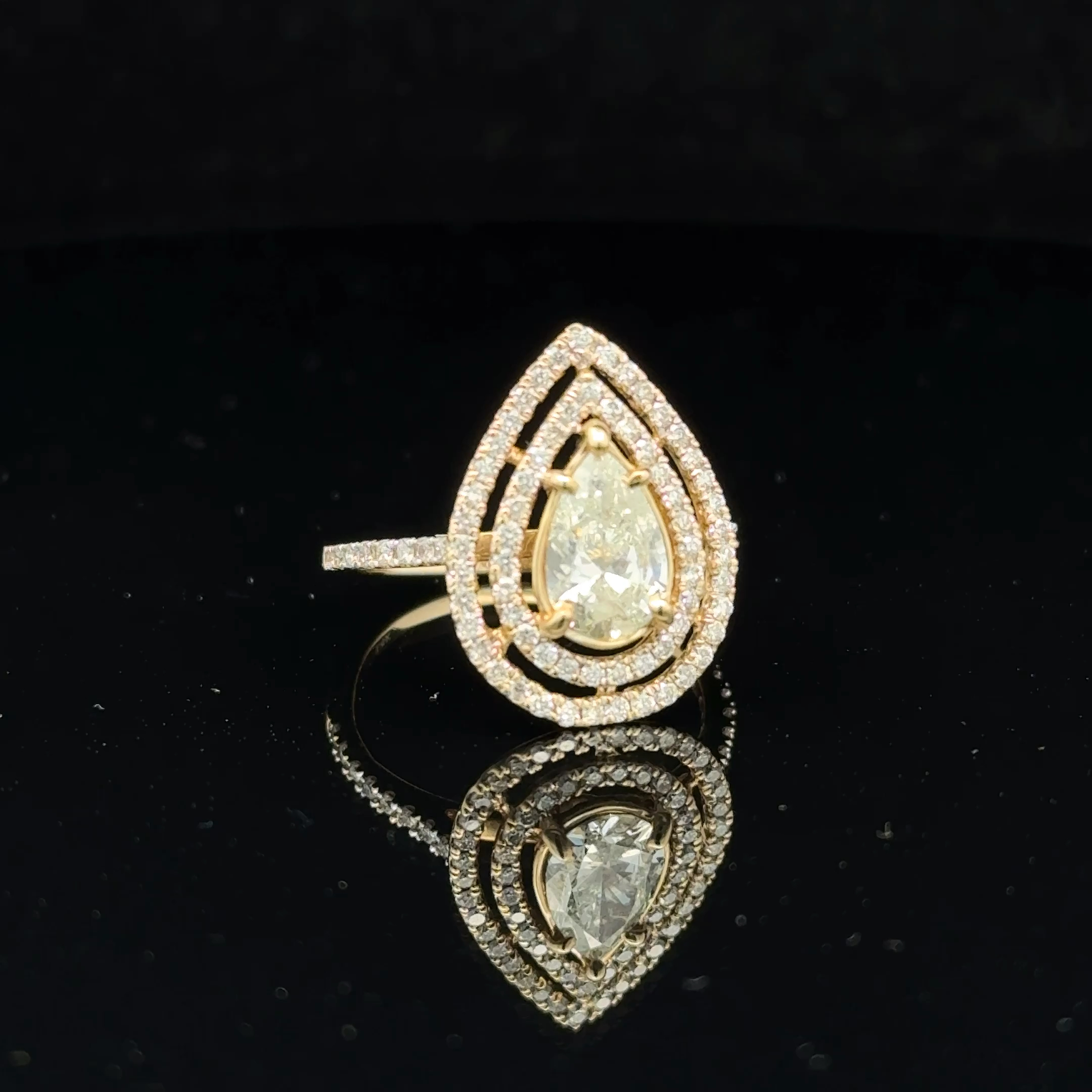 Elevate your elegance with this captivating Pear Double Halo ring, crafted in radiant yellow gold. Showcasing a mesmerizing pear-shaped diamond with a brilliant cutting style, this ring exudes sophistication and charm. A statement piece that adds a touch of glamour to any ensemble.